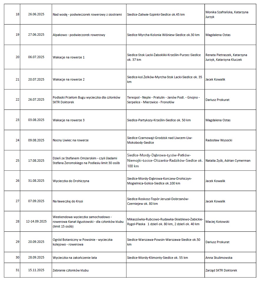 Plan wycieczek rowerowych na 2025r.