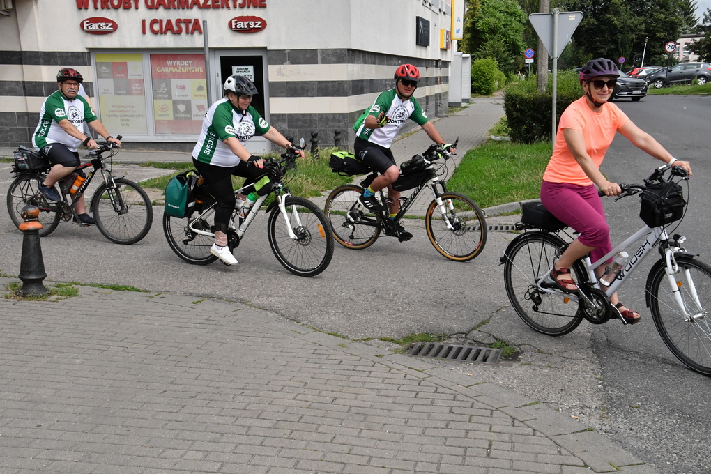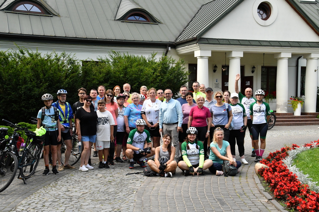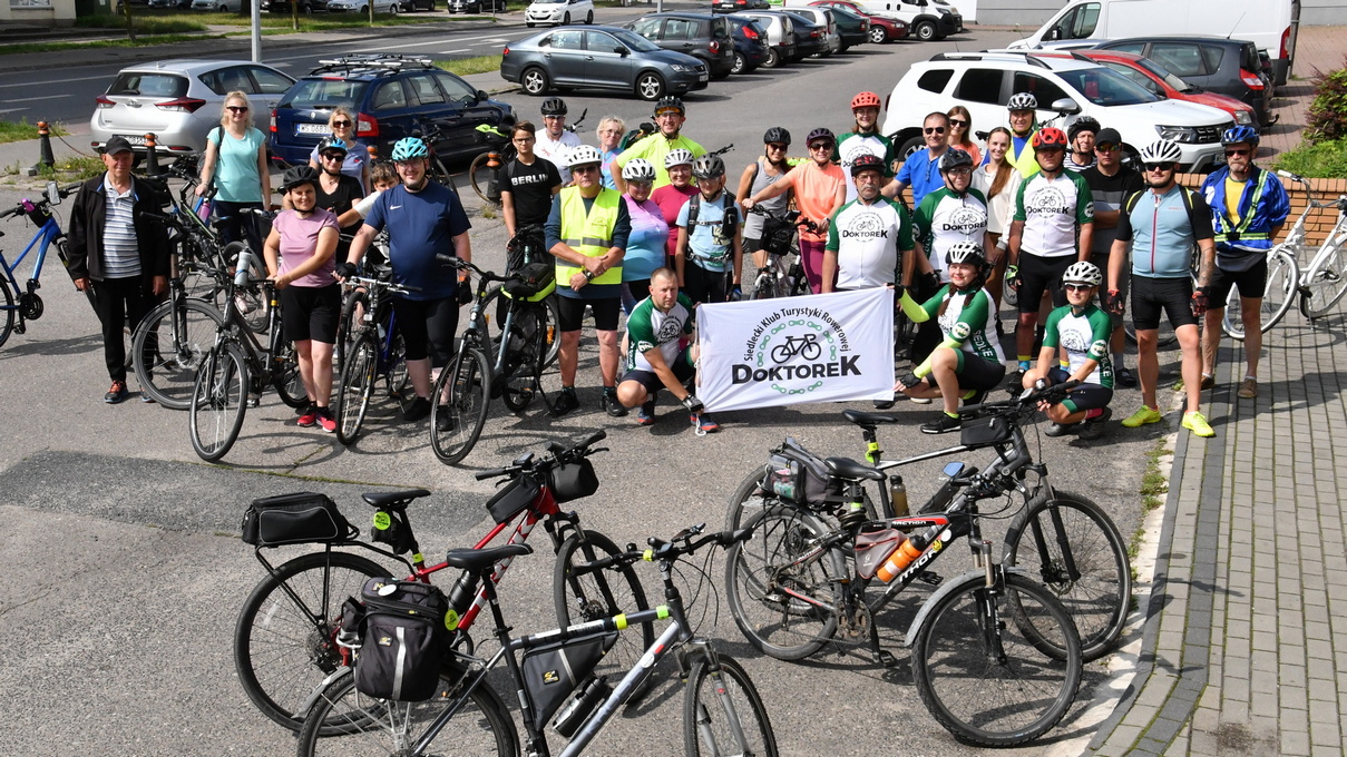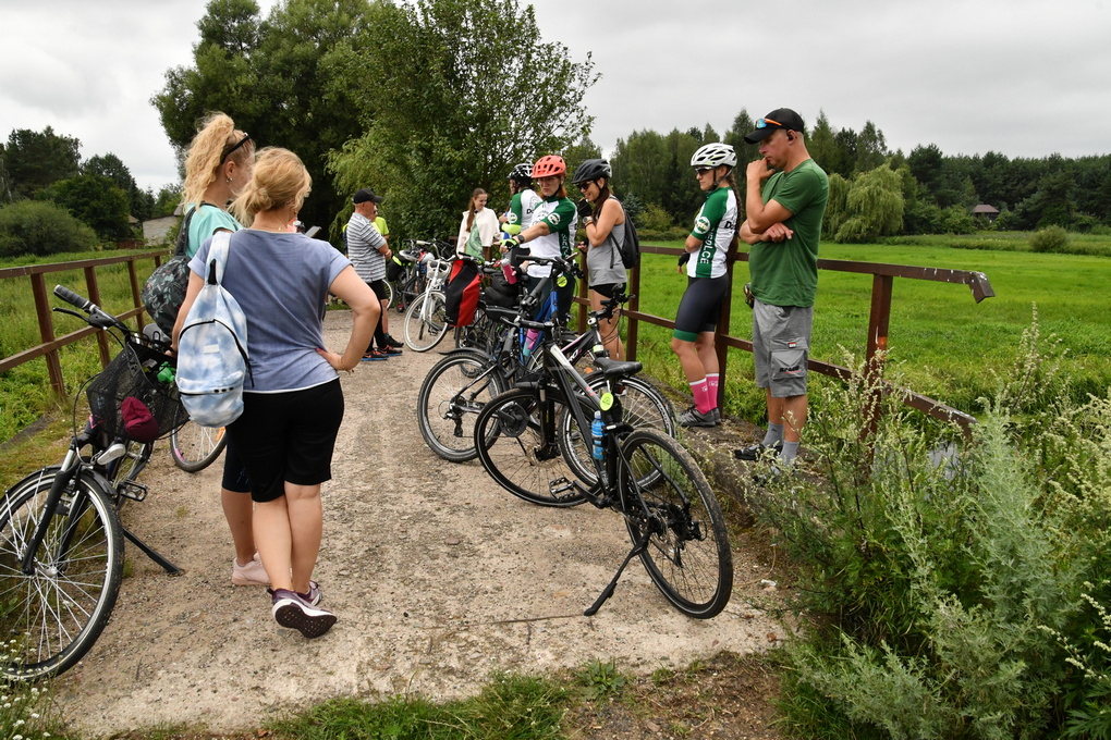 Na drugą wycieczkę z cyklu „Wakacje na rowerze” obraliśmy sobie za cel przejechanie oficjalnego szlaku PTTK „Dolina Muchawki”. Mimo niesprzyjających prognoz pogodowych na starcie pojawiło się 36 uczestników. Po zrobieniu pamiątkowego zdjęcia udaliśmy się w stronę wszystkim dobrze znanego Zalewu Siedleckiego. Objechaliśmy go od strony wału skąd mieliśmy widok na naszą tytułową Muchawkę. Następnie udaliśmy się w stronę kolonii Żelków i Wólki Wołynieckiej, gdzie zrobiliśmy przerwę na podziwianie rzeki wijącej się wśród pól. Tutaj też Radosław Wysocki zrobił krótki wykład i prezentację na temat jazdy rowerem „obok siebie”. Uczestnicy zostali też obdarowani zawieszkami odblaskowymi na rower, które zostały zakupione w ramach dofinansowania z Urzędu Miasta oraz ulotkami przygotowanymi przez Radosława Wysockiego na temat najważniejszych przepisów drogowych dotyczący jazdy rowerem. Po odpoczynku pojechaliśmy urokliwą drogą przez okoliczne lasy. Dotarliśmy do kolejnego punktu naszej wycieczki, a mianowicie Dworu Mościbrody, gdzie pan Adam Filipczuk opowiedział nam krótką historię tego miejsca i okolicznych stawów, w których hodują karpie. Tutaj także zrobiliśmy dłuższą przerwę żeby skorzystać z oferty gastronomicznej tego miejsca oraz podelektować się sielskim klimatem. „Niestety” nasz odpoczynek przedłużył się nieznacznie w tym miejscu z powodu intensywnych opadów, na szczęście schroniliśmy się w licznych altankach i nikt nie zmókł. W drogę powrotną udaliśmy się przez pobliski Helenów, gdzie mogliśmy zobaczyć jak idą prace nad autostradą, potem przez Stok Lacki wróciliśmy do Siedlec. Pokonaliśmy wspólnie 33 km w bardzo „spacerowym” tempie. Komandor wycieczki Jacek Kowalik